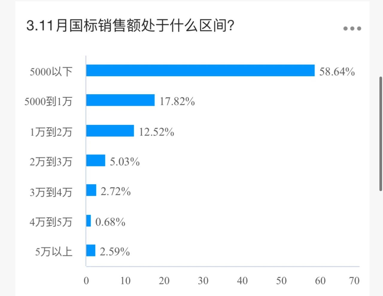 调查显示,59%的店主国标销售额在5000元以下,5000到1万的占比18%,1万到2万的占比13%,5万以上仅占不到3%。
